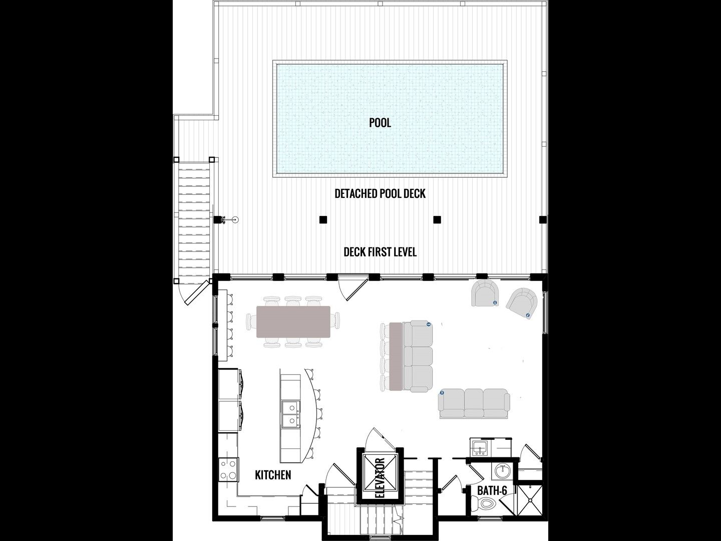 - Main Living Room/Kitchen/Dining and Elevated Pool with Entertainment Area on First Floor