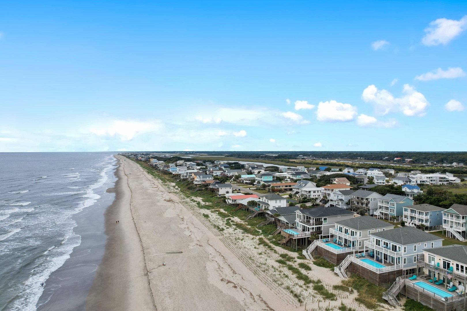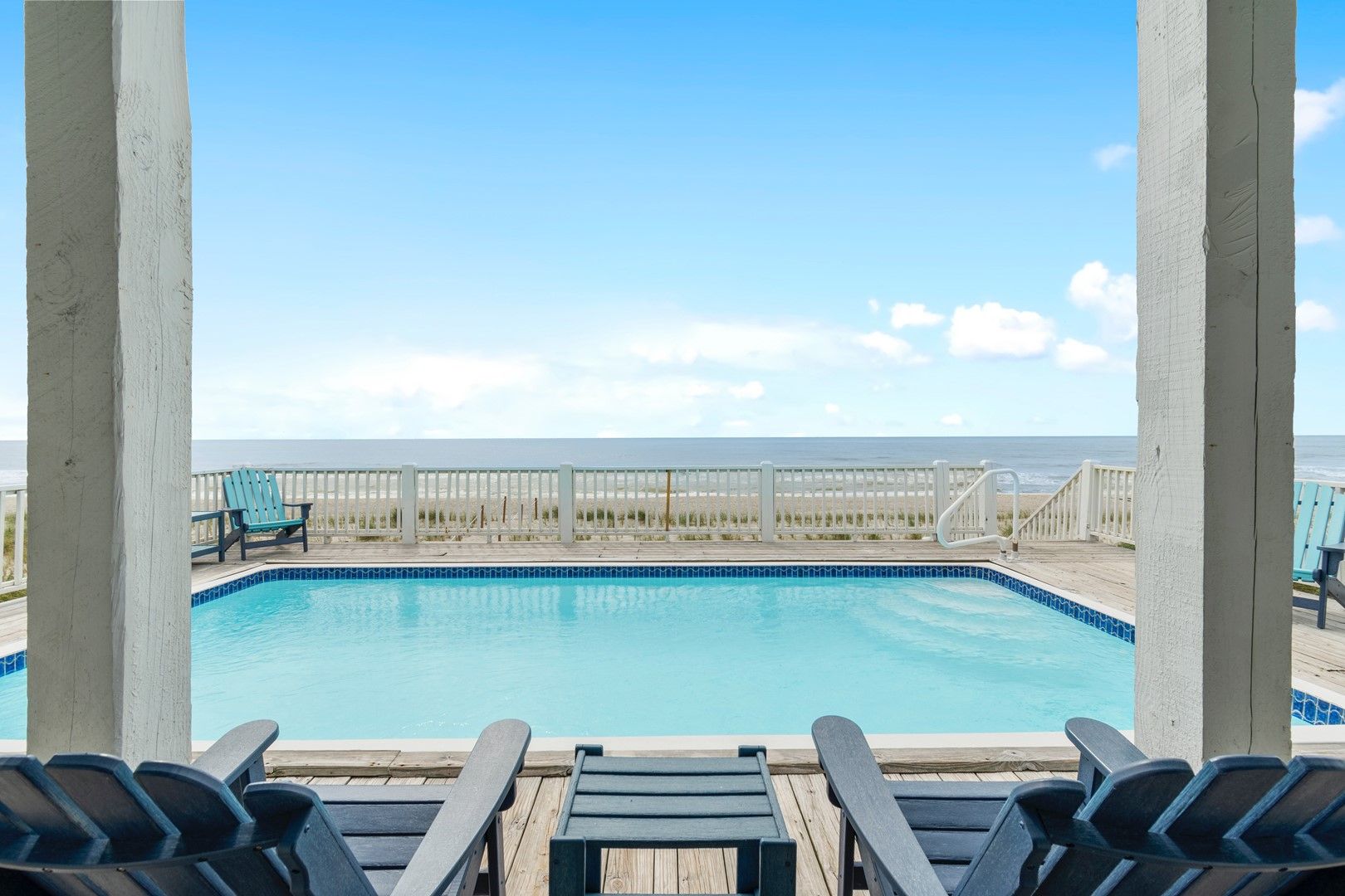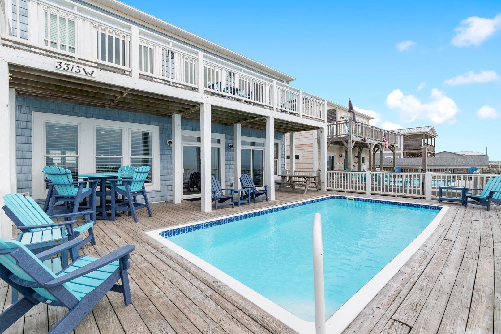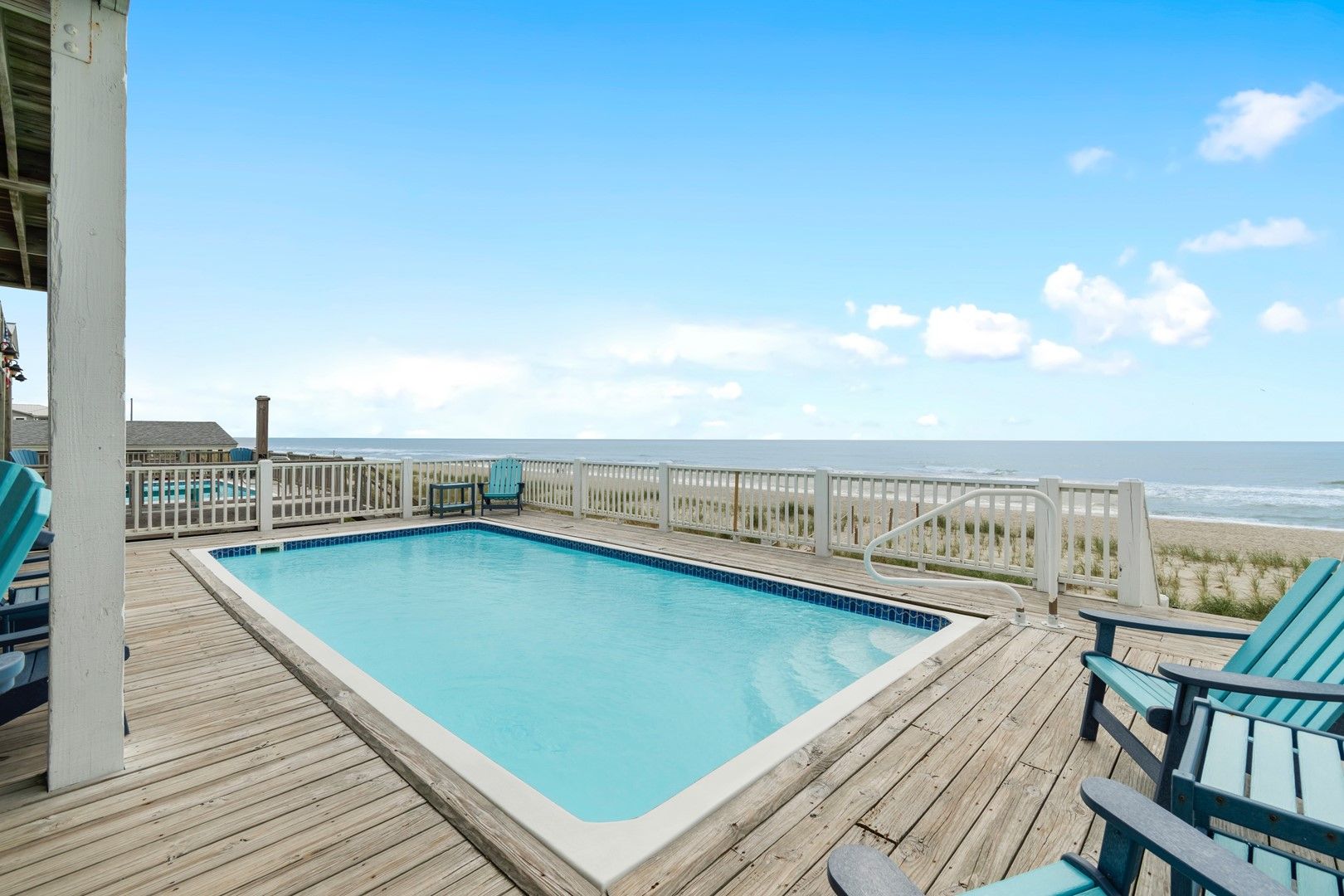 This stunning oceanfront home has a fantastic elevated in-deck swimming pool uniquely designed with an extended deck over the dunes, allowing you to feel like you are part of the action on the beach.