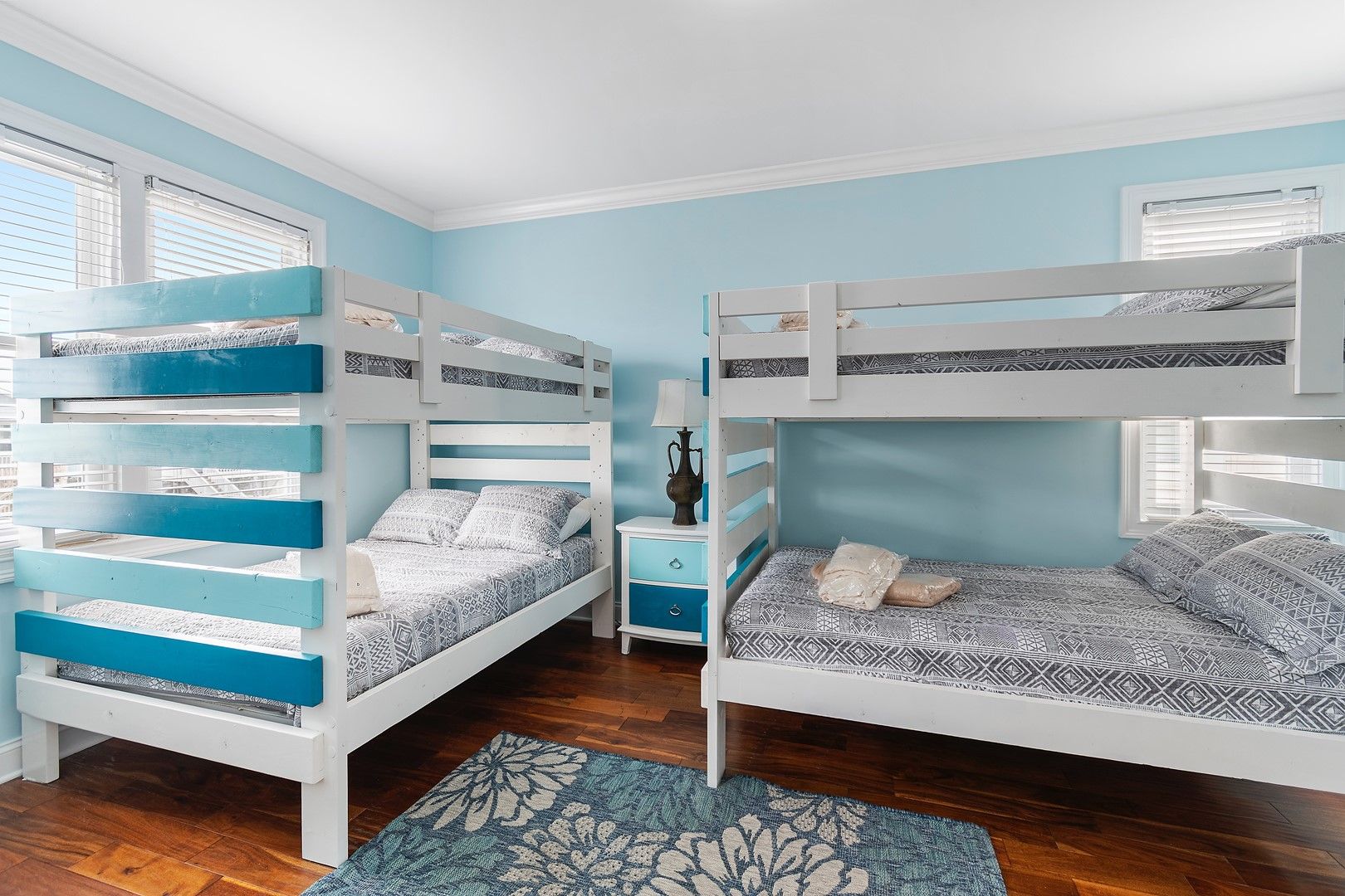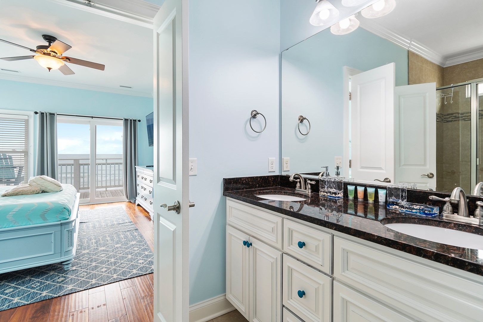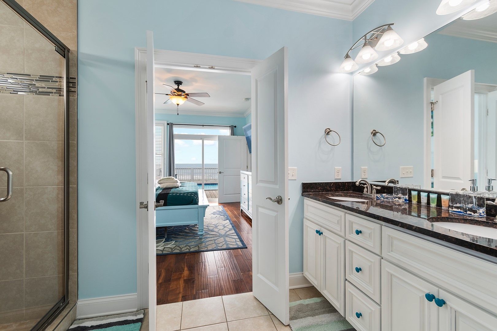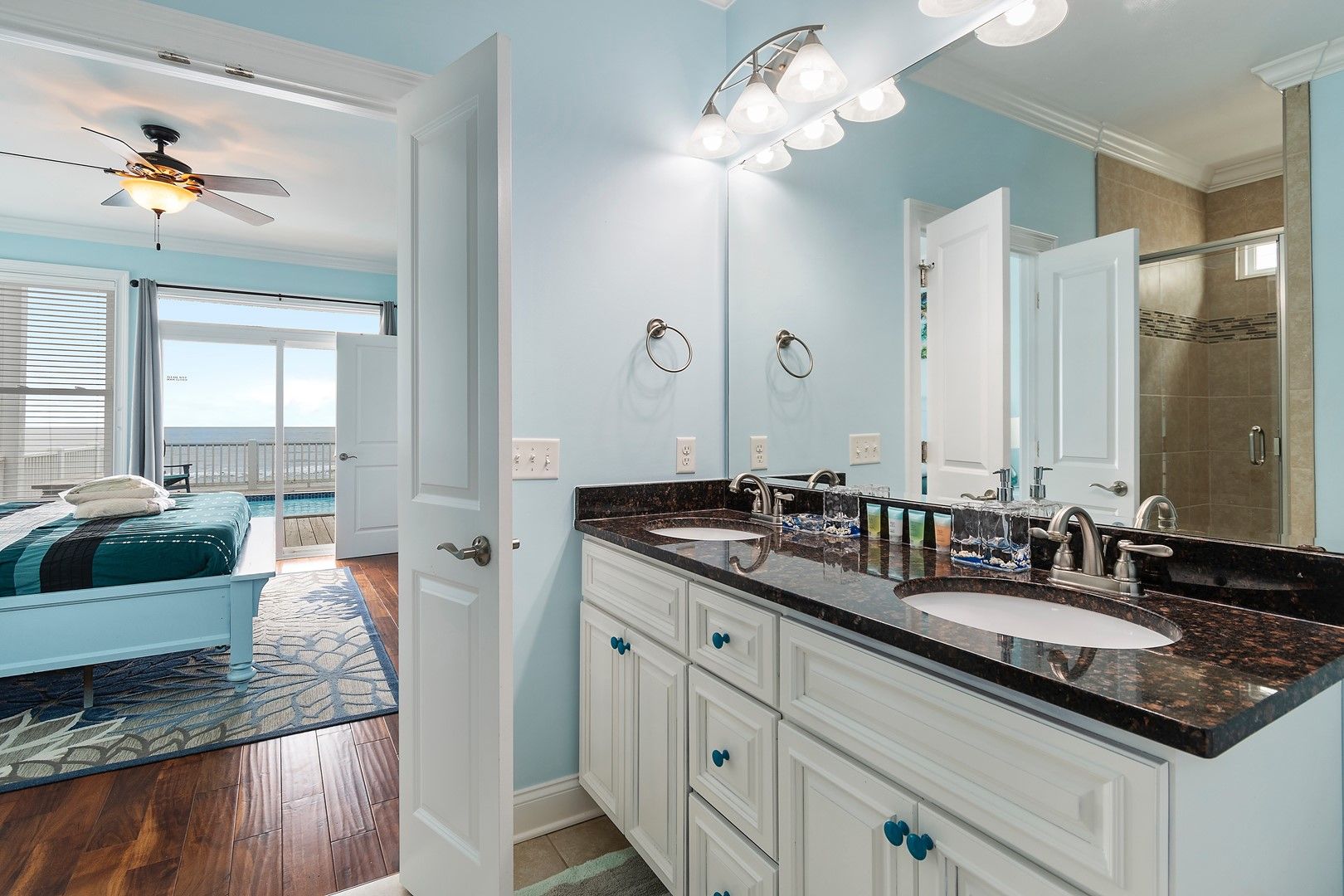 Five of the bedrooms are suites with their private baths.  Two of these bedrooms are true luxury master suites with extensive custom tile showers. The final two bedrooms share a large bathroom with a large double vanity.  Space is not a problem here!  Each master bedroom has a king bed.  The bedroom downstairs has 2 bunk beds, double over double, perfect for a small family or kids (this room sleeps 8).