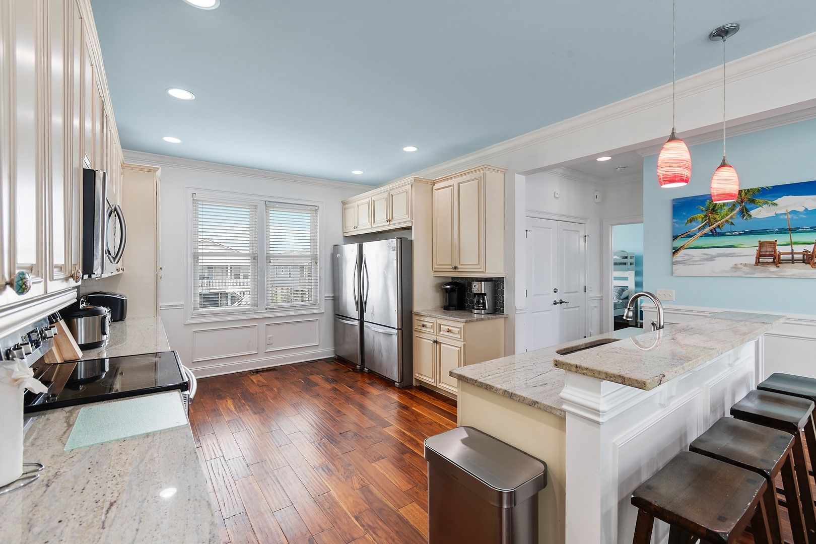This home had everything you needed . Two large refrigerators, two coffee pots and a keurig. The decks were a bit small for a full house and could use some lounging chairs . Overall the place was wonderful. Thank you !