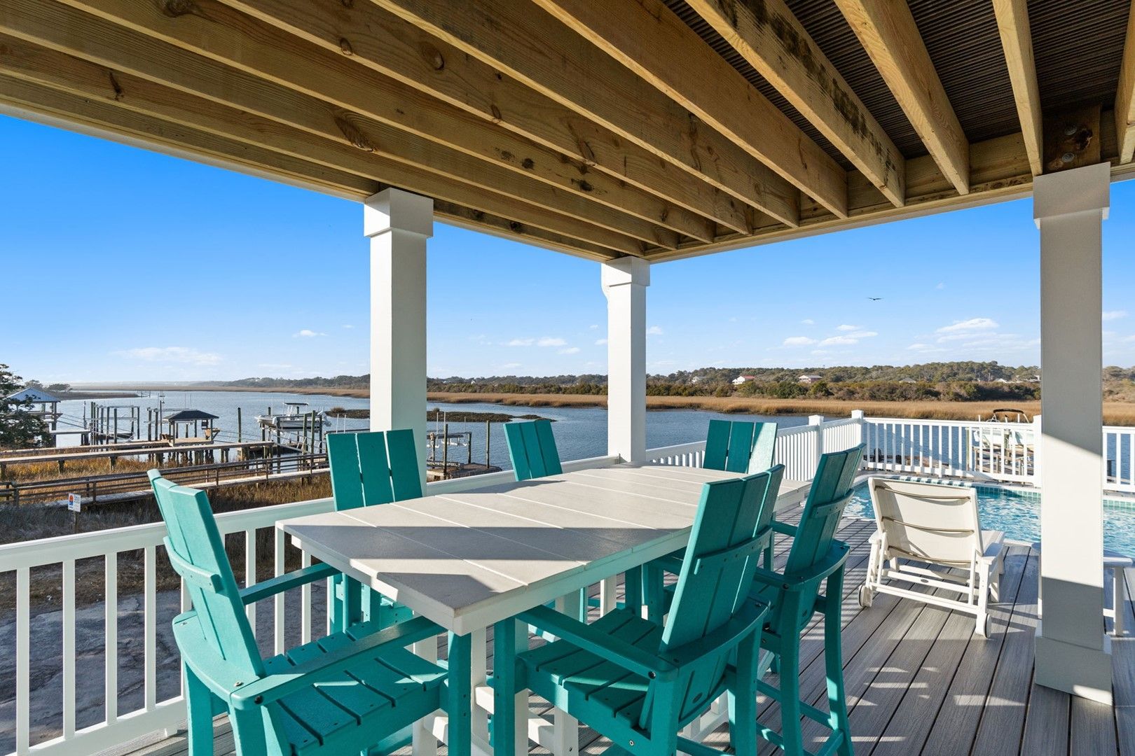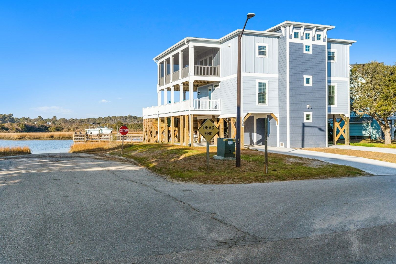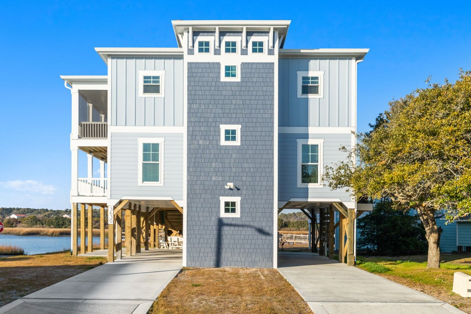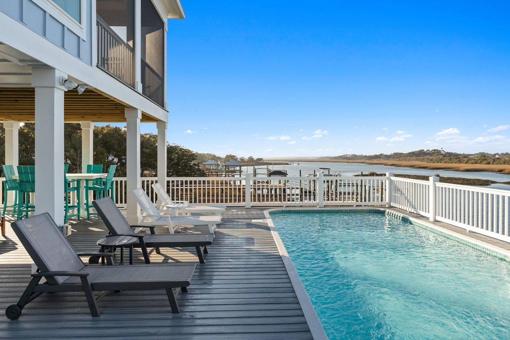 This newly constructed home is ideally located on a corner lot on Oak Island's west end, giving you access to various bodies of water to explore!  Such a fantastic and rare find to be right next to a Public Water Access with the beach access just a short walk down the same street!  Plus, a public boat ramp a few blocks away!  Water lover's will never want to leave!  Inside, this home is perfectly suited for unforgettable comfort and relaxation to be able to unwind when you are not out at the water.  With a reverse, open-concept floor plan you will find the top level offers a very spacious main great room, dining and kitchen, as well as a primary king bedroom with private bath.  The bottom floor offers the remaining 4 bedrooms - 2 bedrooms are kings, each with their own private bath, and the other 2 bedrooms offer a king in one and 2 bunk beds twin over twin in the other.  These 2 bedrooms share a hallway bath.  There is also a 2nd living area with wet bar just off the pool deck.  This 2nd living area also offers extra sleeping space with a double sleeper sofa.  Get ready to make Docks and Dunes your new sweet spot at the beach!  This rare find won't last long, so make your reservation today before this island treasure gets taken!!!!