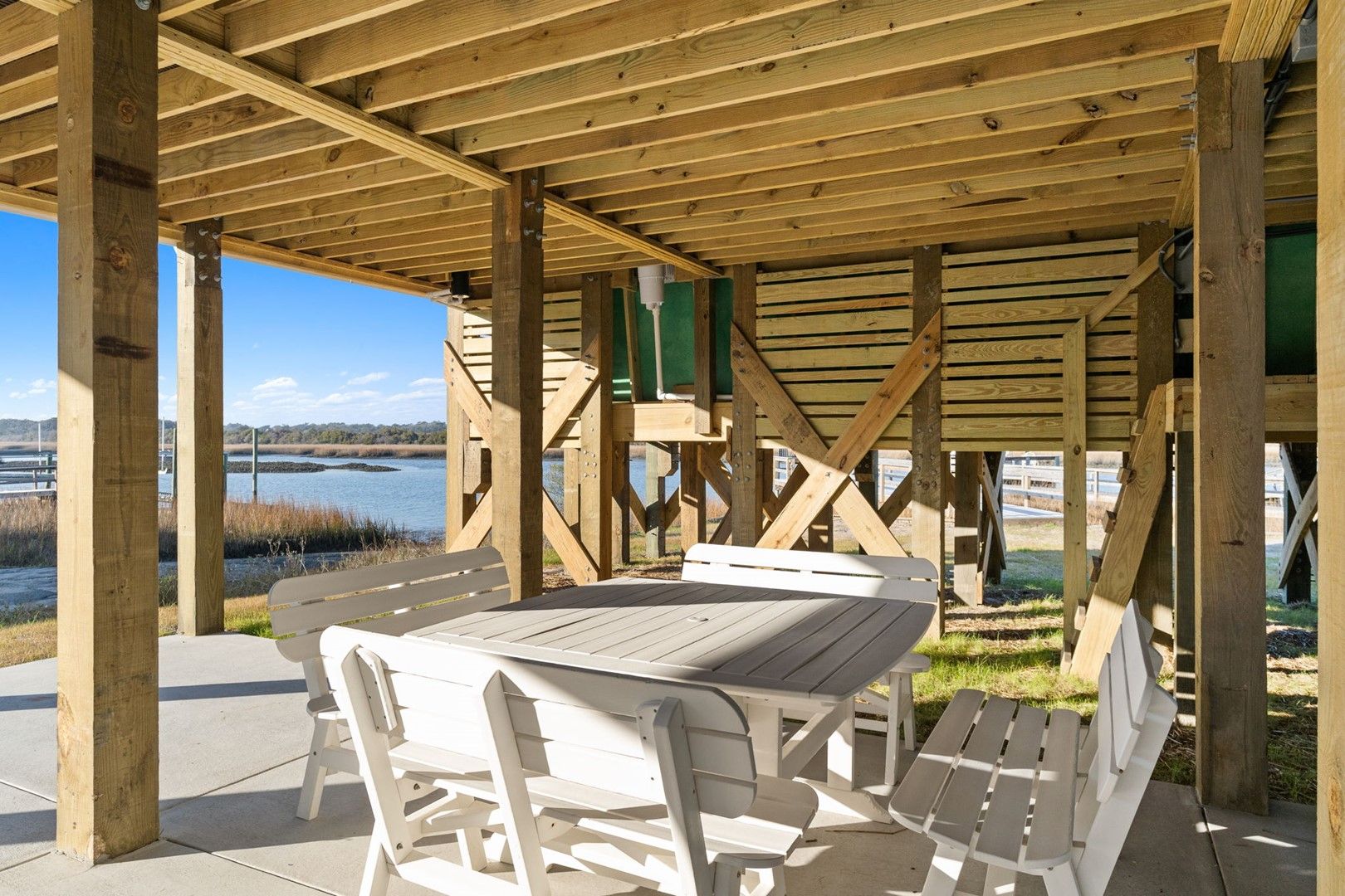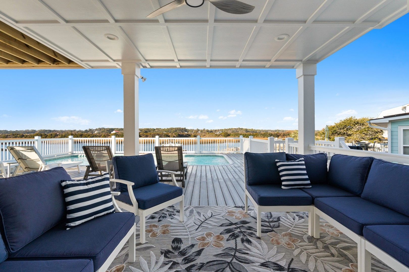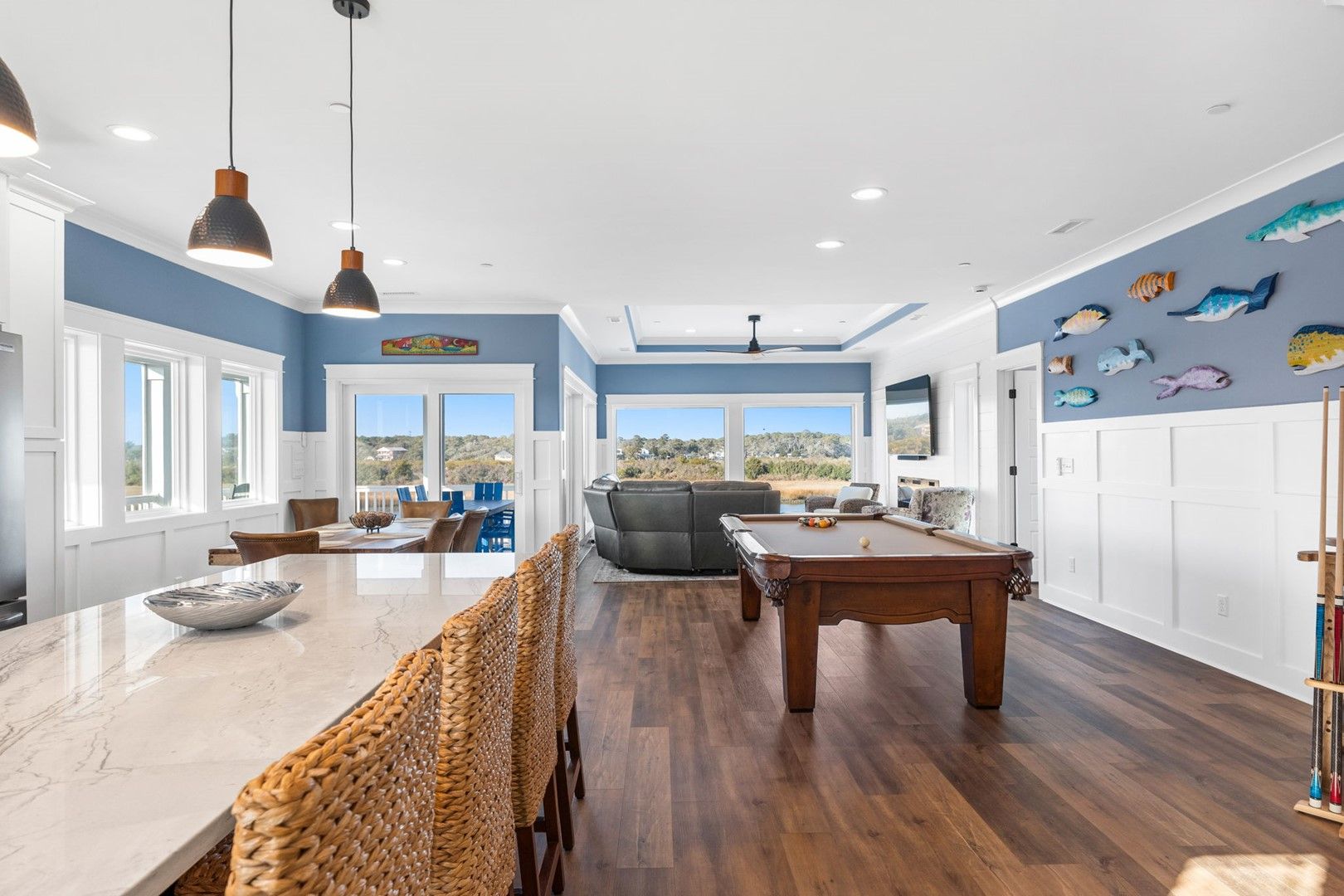 This newly constructed home is ideally located on a corner lot on Oak Island's west end, giving you access to various bodies of water to explore!  Such a fantastic and rare find to be right next to a Public Water Access with the beach access just a short walk down the same street!  Plus, a public boat ramp a few blocks away!  Water lover's will never want to leave!  Inside, this home is perfectly suited for unforgettable comfort and relaxation to be able to unwind when you are not out at the water.  With a reverse, open-concept floor plan you will find the top level offers a very spacious main great room, dining and kitchen, as well as a primary king bedroom with private bath.  The bottom floor offers the remaining 4 bedrooms - 2 bedrooms are kings, each with their own private bath, and the other 2 bedrooms offer a king in one and 2 bunk beds twin over twin in the other.  These 2 bedrooms share a hallway bath.  There is also a 2nd living area with wet bar just off the pool deck.  This 2nd living area also offers extra sleeping space with a double sleeper sofa.  Get ready to make Docks and Dunes your new sweet spot at the beach!  This rare find won't last long, so make your reservation today before this island treasure gets taken!!!!