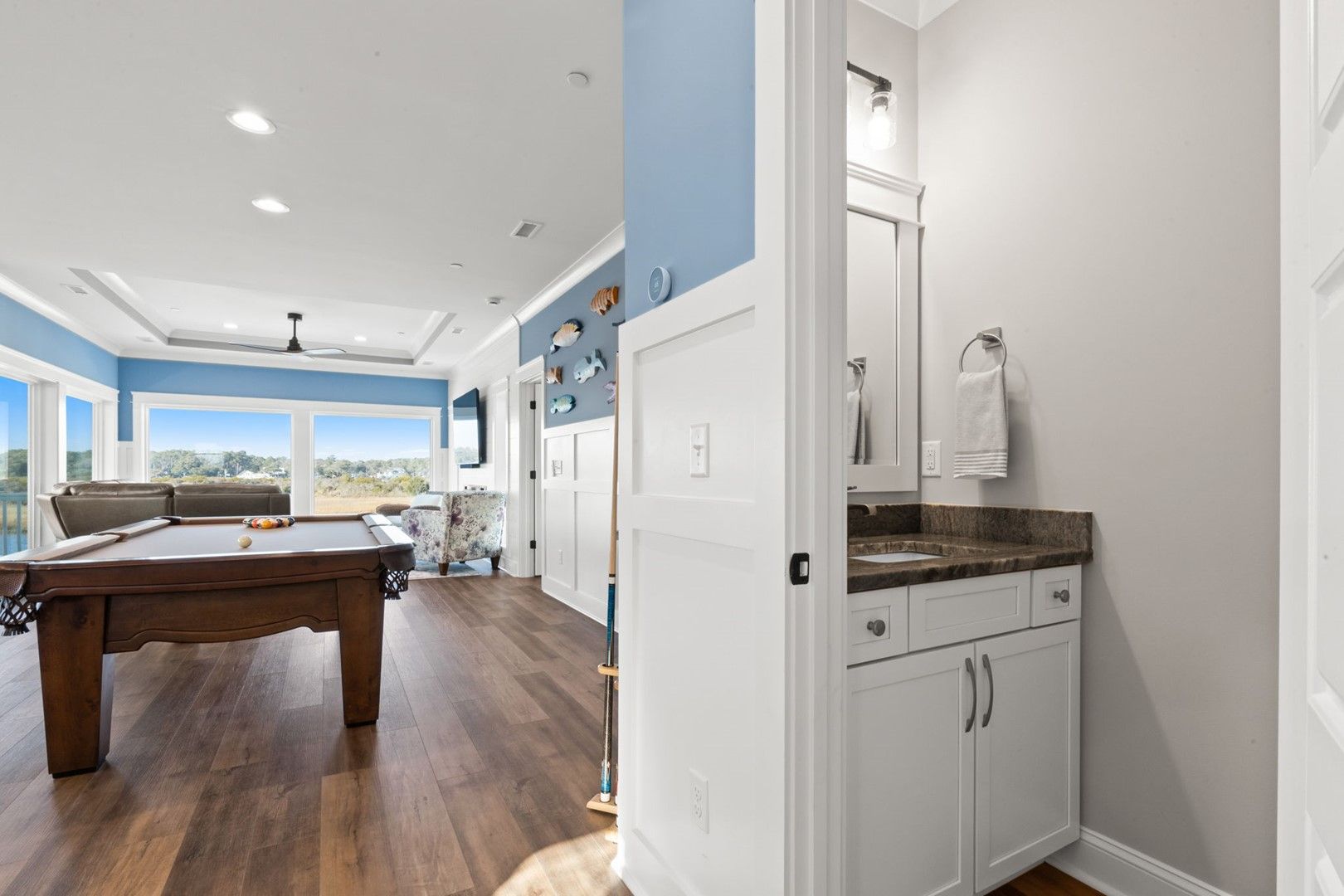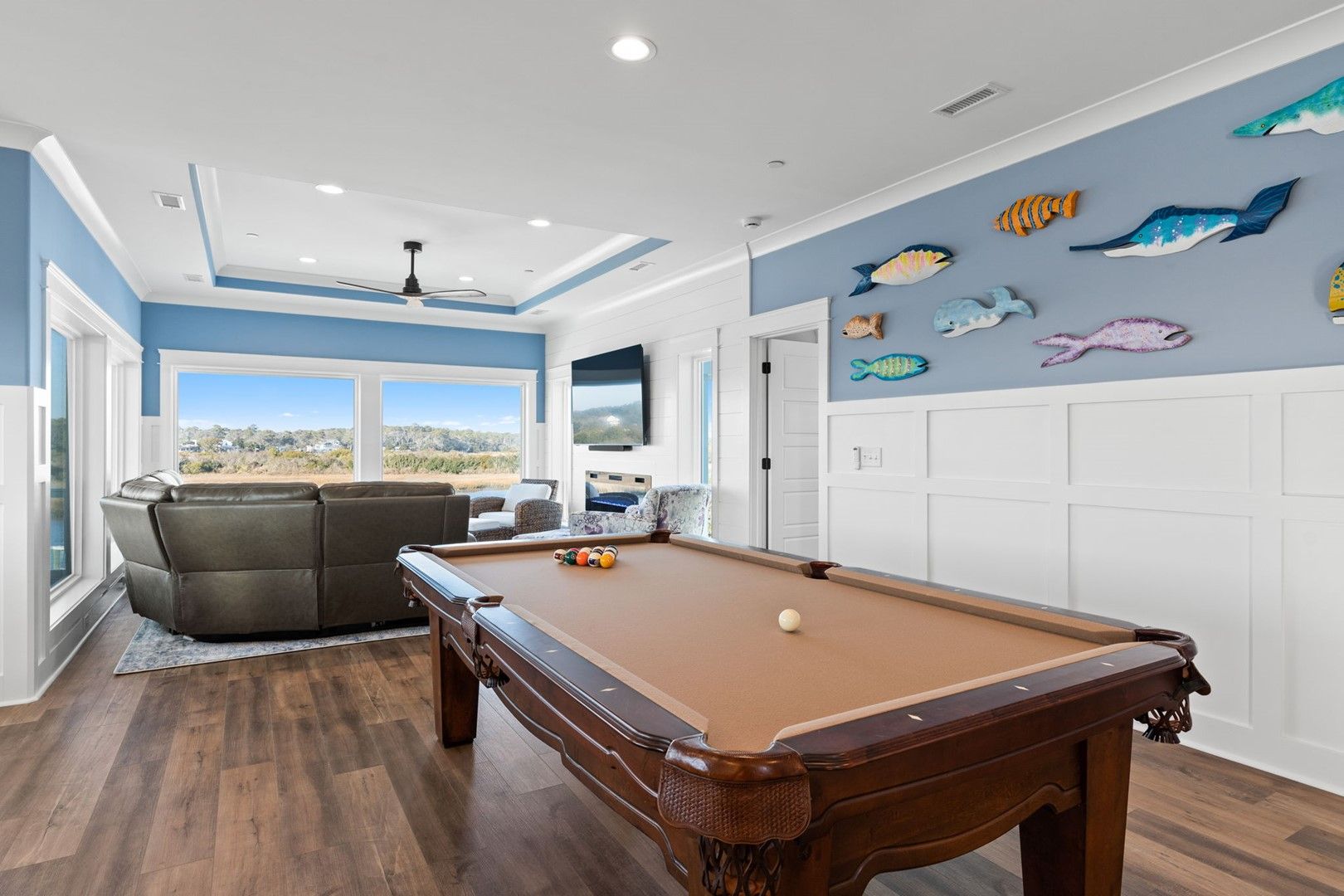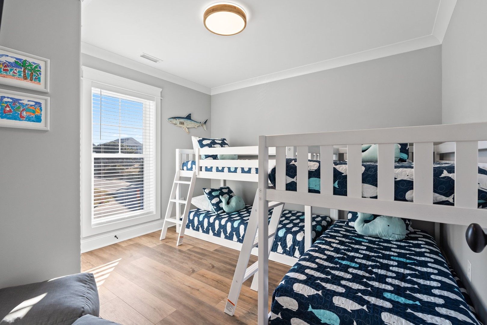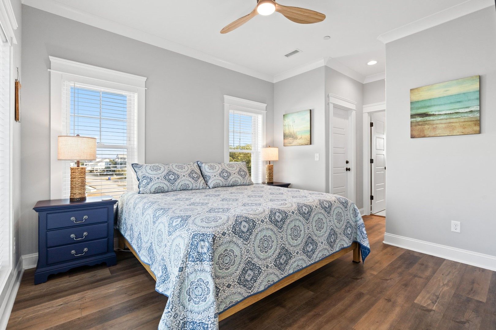 This newly constructed home is ideally located on a corner lot on Oak Island's west end, giving you access to various bodies of water to explore!  Such a fantastic and rare find to be right next to a Public Water Access with the beach access just a short walk down the same street!  Plus, a public boat ramp a few blocks away!  Water lover's will never want to leave!  Inside, this home is perfectly suited for unforgettable comfort and relaxation to be able to unwind when you are not out at the water.  With a reverse, open-concept floor plan you will find the top level offers a very spacious main great room, dining and kitchen, as well as a primary king bedroom with private bath.  The bottom floor offers the remaining 4 bedrooms - 2 bedrooms are kings, each with their own private bath, and the other 2 bedrooms offer a king in one and 2 bunk beds twin over twin in the other.  These 2 bedrooms share a hallway bath.  There is also a 2nd living area with wet bar just off the pool deck.  This 2nd living area also offers extra sleeping space with a double sleeper sofa.  Get ready to make Docks and Dunes your new sweet spot at the beach!  This rare find won't last long, so make your reservation today before this island treasure gets taken!!!!