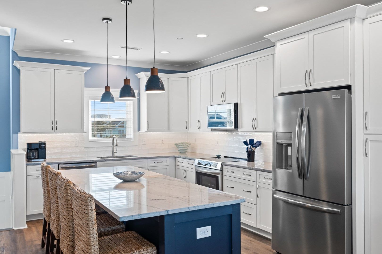 - Kitchen:  Quartz countertops.  Island breakfast bar.  Stainless-steel appliances.  Refrigerator with ice maker.  Electric range with cooktop.  Dishwasher.  Microwave.  Crockpot.  Griddle.  Air fryer.  Toaster oven.  Toaster.  Keurig and drip coffee makers.  Blender.  Stock pot.