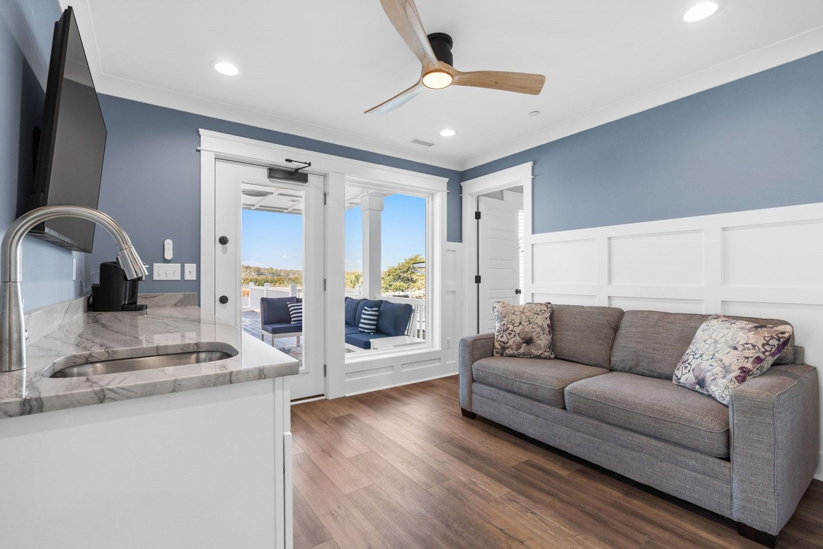 - 2nd living area off the pool deck, featuring a wet bar with sink and mini-fridge - Great for grabbing quick snacks while at the pool or a soothing cup of coffee in the morning!
