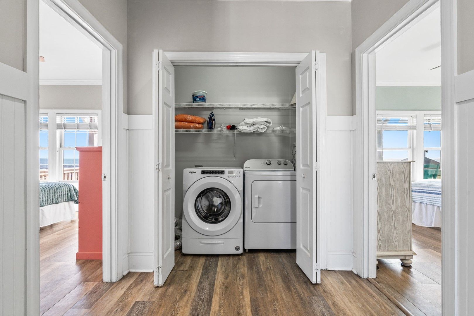 This home offers a flexible layout with multiple private bedrooms and bunk rooms suitable for both adults and children.
