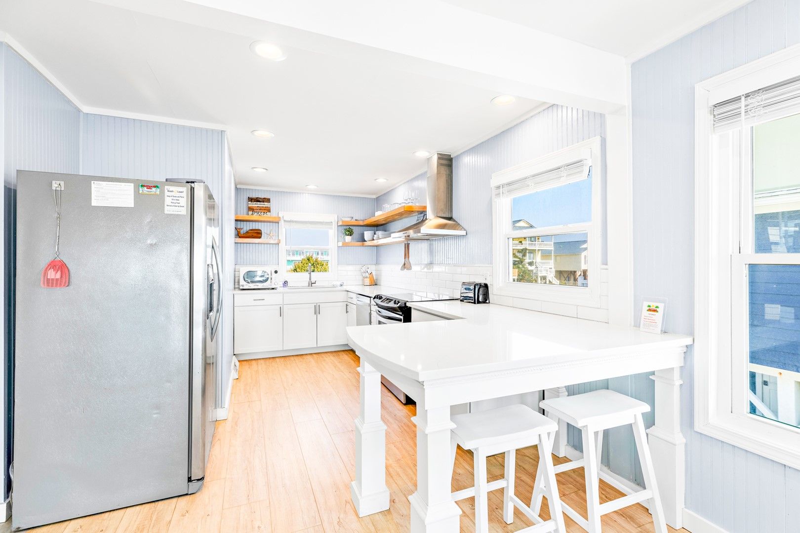 This beach house was a good fit for our family of 7. We appreciated the new cookware, and well the stocked kitchen as we cook most of our meals while on vacation. The gates and fencing were especially nice safety feature for my grandchildren (ages 1 1/2 and 5).We enjoyed the porch, the easy walk to the beach, and the outside shower. The underside of the house provided nice clean storage for our beach gear. Thank you Linger Longer homeowners.