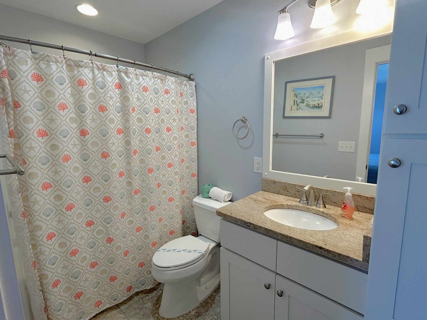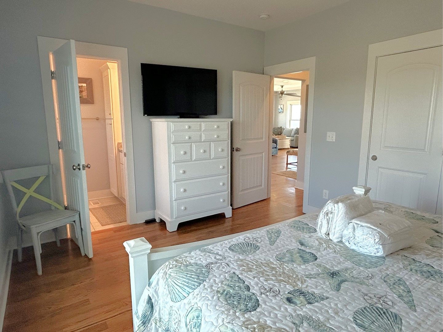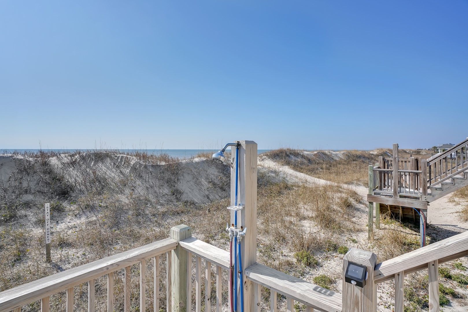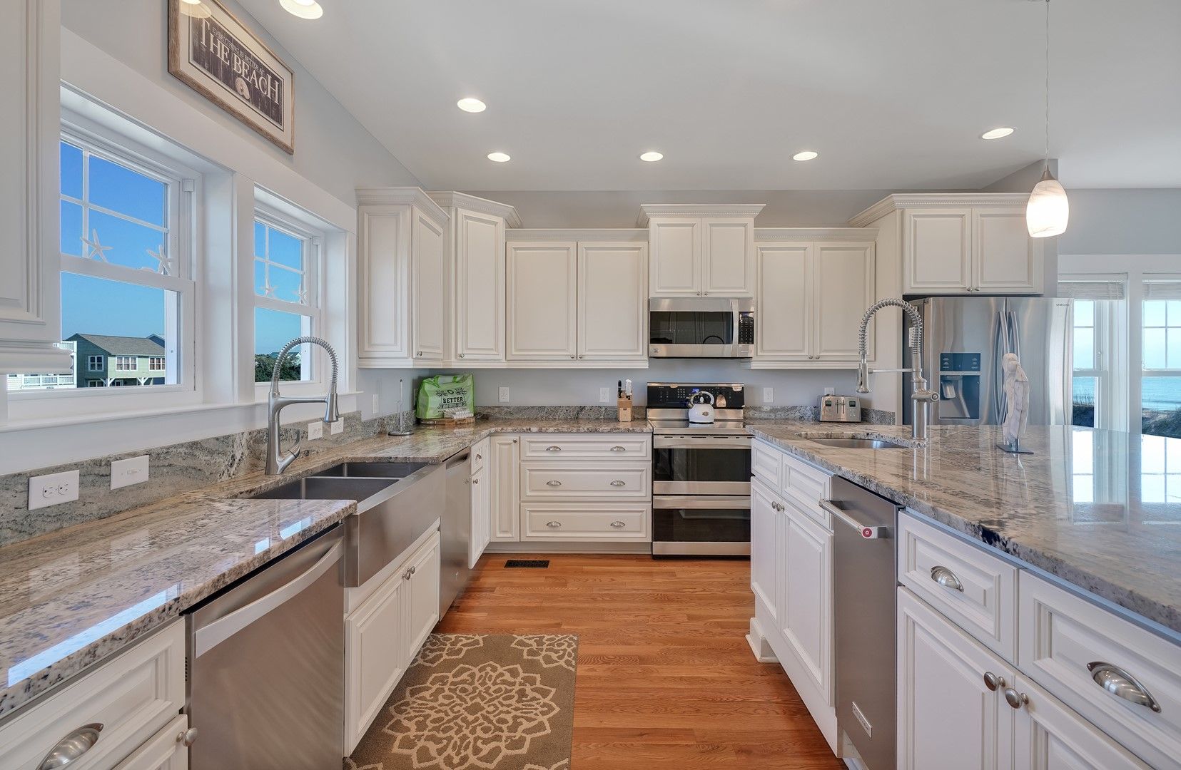 Lovely house with good set-up for multi-generational vacation. Our married children loved having their own King rooms with private bathrooms. Kitchen was very well stocked and having 2 dishwashers, 2 refrigerators, and an ice-maker was so helpful. Deck furniture was solid and in good shape. Easy access to beach a huge plus.Wish we had had access to a vacuum to do a quick clean of floors which got sandy every day. We found some brooms and made do. Nice having outside shower returning from beach and a hose underneath for end of week clean-up. Indoor furniture very kid friendly(esp. dining chairs that were not upholstered),