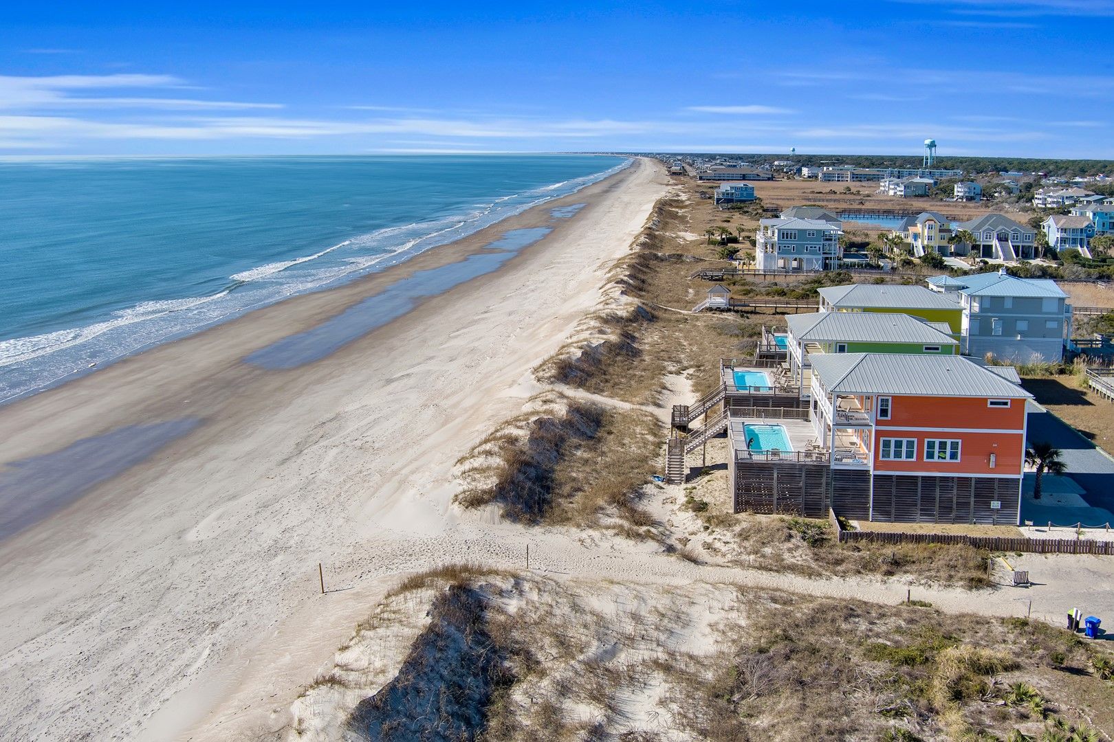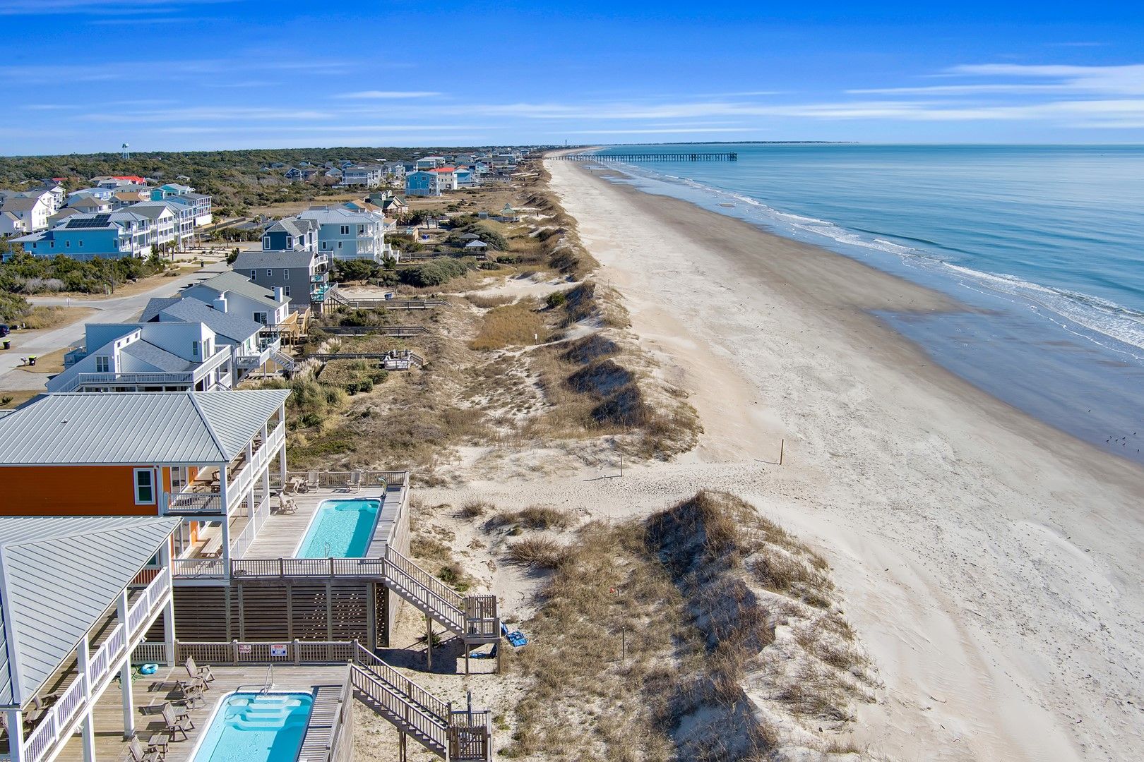 This gorgeous and luxurious home offers everything you could need or want for the most relaxing beach vacation, including spectacular sunrises and sunsets!  Imagine soaking up the warm sun on the elevated in-deck swimming pool overlooking amazing, panoramic ocean views.  Time just slows down once you reach Oak Island.  Fall asleep at night in one of many comfortable bedrooms with the gentle sound of the waves rolling onto shore just outside your window.  You've never slept so good!  Direct beach access is just off the porch for a fun-filled day in the sand building castles with the kids, fishing or just taking a stroll down to the Oak Island Pier.  Grill out your fresh catch on one of the 3 charcoal grills and enjoy as the sun goes down.  Those breathtaking Orange Sunset alone will have you never wanting to leave.  You are sure to want to make this home away from home you new tradition year after year.  Make your reservation today before this island treasure is taken!