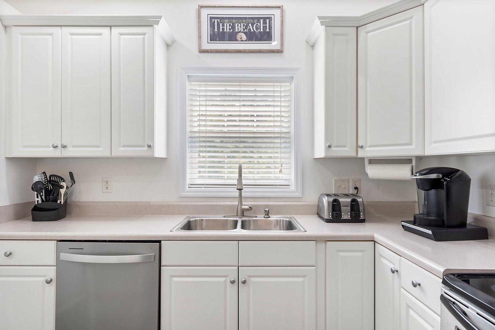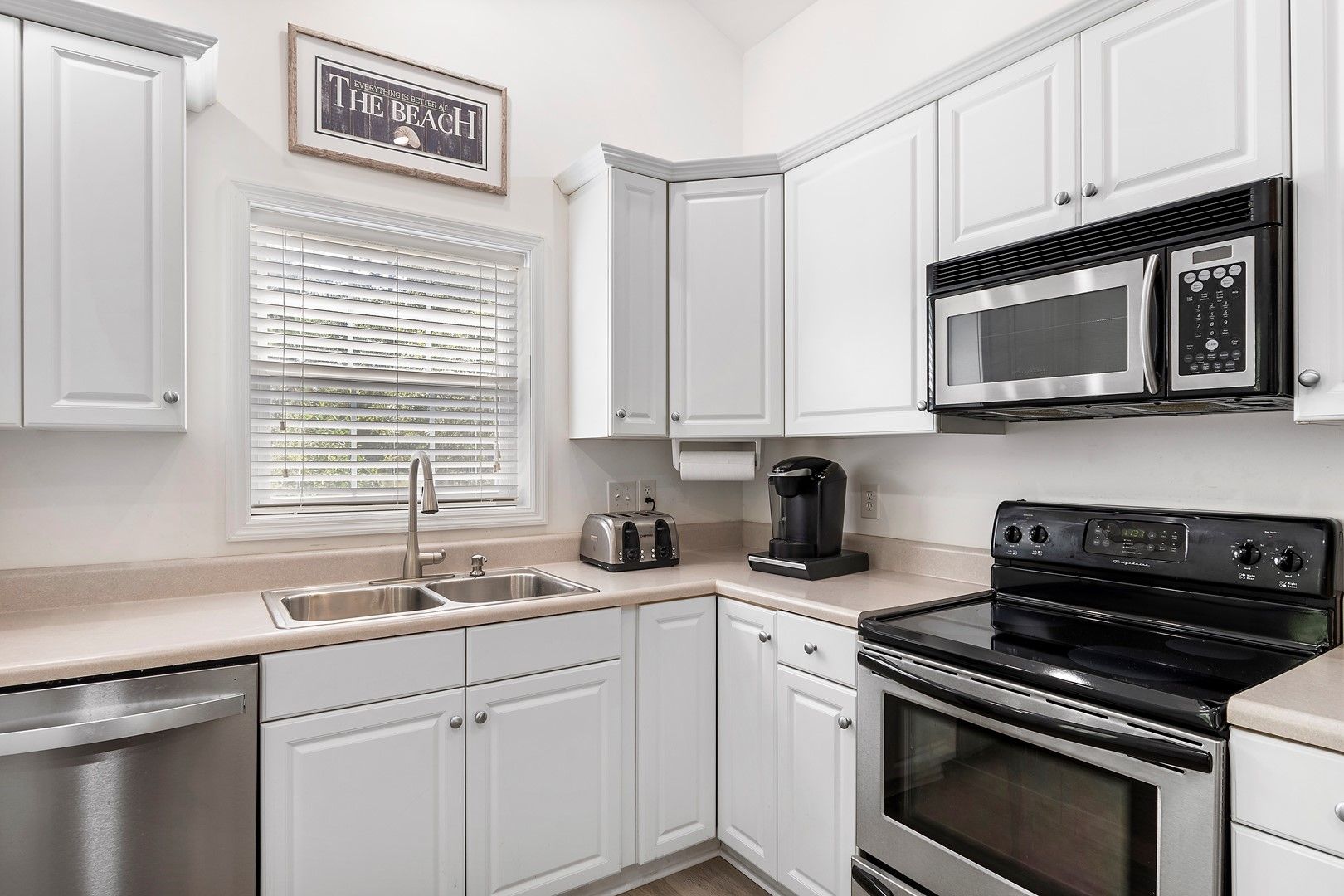 - Kitchen: Stainless steel appliances.  Refrigerator with ice maker.  Electric range with flat-surface cooktop.  Dishwasher.  Built-in microwave.  Keurig coffee maker.   Air fryer.  Blender.  Toaster.  Griddle.